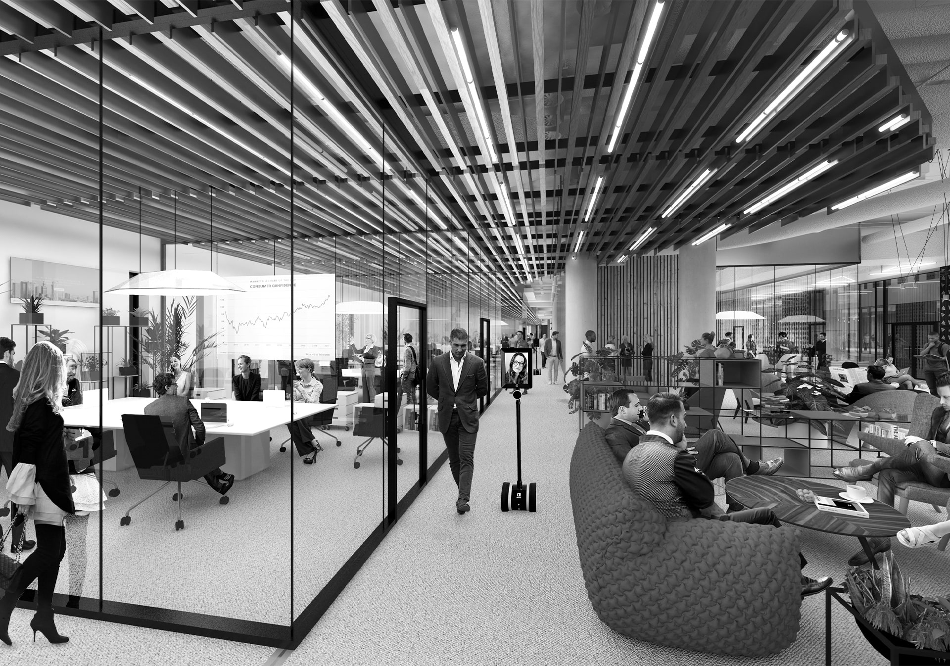The architectural grid is based on a grid of façade profiles and enables the space to be divided into individual units with a minimum width of approx. 2.60 m depending on the location. The varying depth of the passageways makes it possible to arrange open space, office space or mixed spaces.
